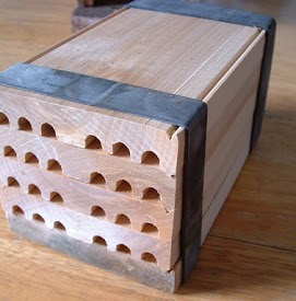 Orchard Mason Bee Nesting trays. Traditionally a board with long grooves in which the Mason Bee lays its eggs and prepares them for life. The accepted optimal length is 6 inches, and this is important as the Bee lays females in the back of the channel and males in the front, slightly favoring the males in number. A channel that is too long or too short may disturb this ratio. The accepted size of the channel is 5/16 inch. This allow the Bee to work and turn, but limits the amount of mud required to separate her offspring, giving her more time to produce new eggs.