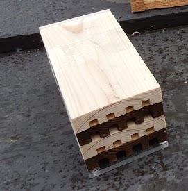 Start with 25″ or more length of wood, then cut all your grooves. Cut the wood into 6″ sections for the final product. This avoids working with small pieces of wood in high speed machines. Finally, carefully sand all the grooves so that all edges are smooth. I emerge the final product in a sloppy mix of garden soil and water (mud) for a couple days to darken it a bit, and to combat the “new” smell. Mason bees don’t like new.