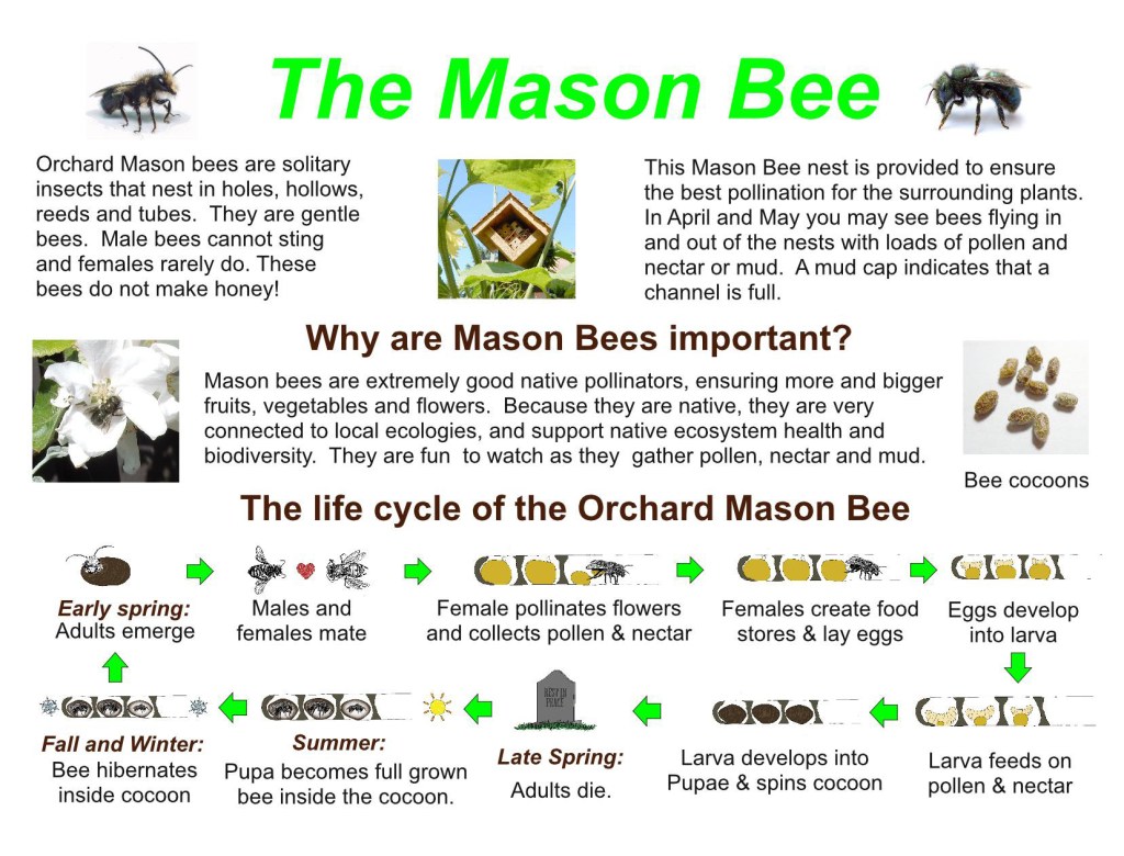 I have educational Mason Bee displays at some public gardens and public schools in the Victoria area. The goal of these displays is to have a functional nest set up in a manner that passerby’s can view the Mason Bee in action. I do have a small information sign that can accompany the nest, but alternatively the manager of the site can have their own signage near the display.