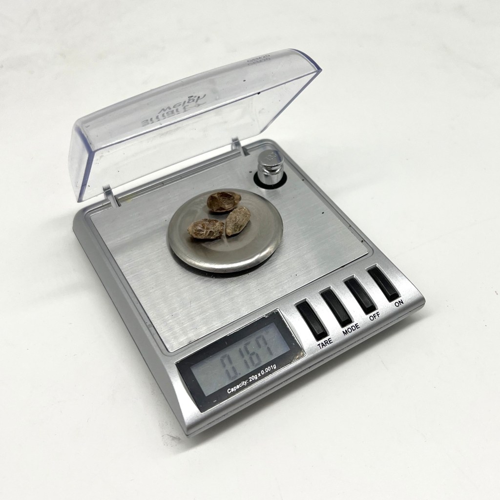 Designed to weigh small jewelry, this remarkably sensitive scale is excellent for weighing cocoons. Large cocoons are females, small ones males. But there are many in between that are very difficult to tell. Females are heavier, and this scale can narrow the choice quickly. Roughly, males weight less than 100 mg. and females over 110 mg. but the weights change with the season as they lose weight steadily from July to April. Even an empty cocoon will register 6 mg. This one was $60 Canadian. but many are as low as $20.