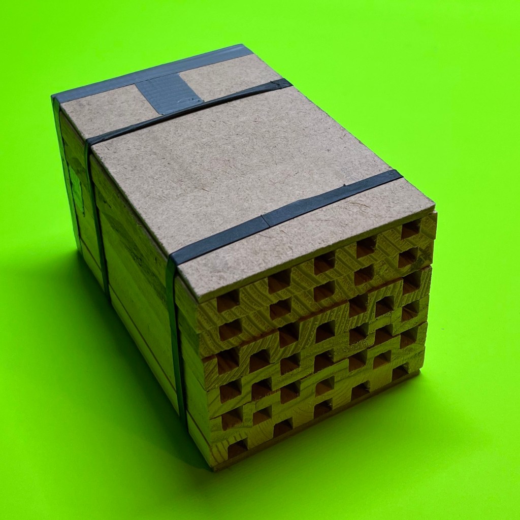 Make a “sandwich” of several trays. It should be large enough to almost fill the house. Any extra space should be filled with a material that will prevent bees and pests from entering. Bind the trays tightly with tape, zip ties, string etc. In this case I used bike tubes cut 1/4″ wide. Commercial nests can be purchased on the WEB.